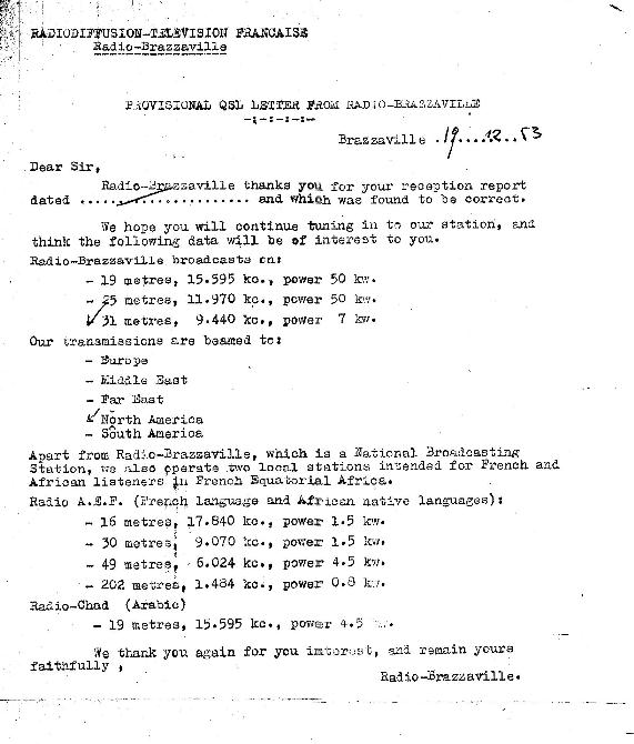 FRENCH EQUATORIAL AFRICA QSL letter from Radio Brazzaville in French Equatorial Africa for report in 1953 on 9.440 MHz. Power was 7,000 watts.