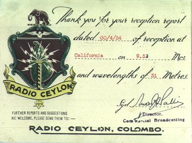 QSL card from Radio Ceylon for report on 30 April 1954 on 9.520 mHz. Power was 7500 watts.