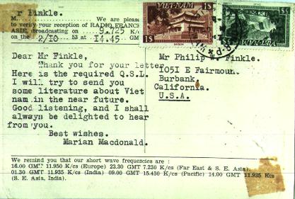 This station was a very popular station that broadcast English programming in the early mornings USA west coast time. At this time, Viet Nam was a kingdom that was still under French influence. Back to Home Page |