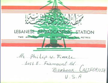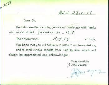 LEBANON QSL card from the Lebanese Broadcasting Station in Beirut for report of 20 Jan. 1956 on 8.036 mHz. Power was 2500 watts. This was from the station FXE of the Lebanese Broadcasting Station that used to transmit on 8.036 mHz. This was an official government short wave station from the mid-1950s. Back to Home Page |