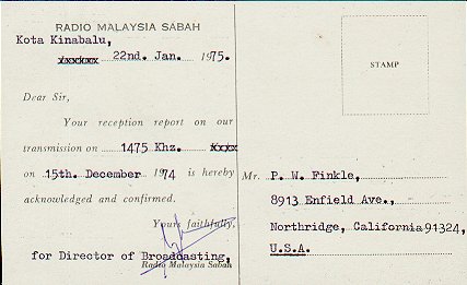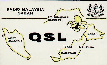 EASTERN MALAYSIA (SABAH) QSL card from the Radio Sabah, Kota Kinabalu, Eastern Malaysia for report of 15 Dec. 1974 on 1475 kHz. Sabah was formerly known as British North Borneo which was a protectorate and crown colony that consisted of territories in the northern part of the island of Borneo. Great Britain relinquished the colony in 1963. The territory joined Malaysia and is now known as the state of Sabah. The island also includes three other political entities, Malaysian Sarawak, Indonesian Kalimantan, and the independent sultanate of Brunei. |