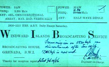 WINDWARD ISLANDS QSL card from the Windward Islands Broadcasting Service, St. Georges, Grenada, for a report of 14 February 1956 on 11.830 MHz. Power was 250 watts At this time the Windward Islands were part of the British West Indies. It gained independence on 4 February 1974. Back to Home Page |