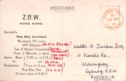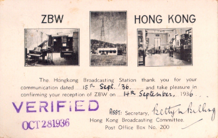 QSL card from the Hong Kong Broadcasting Station for a report of 14 September 1936 on 8.750 MHz. Power was 250 watts