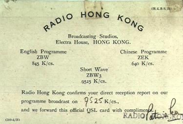 This QSL was from Radio Hong Kong English Service on 9.525 mHz. This was a regular on the west coast of the U.S.A. in those years.