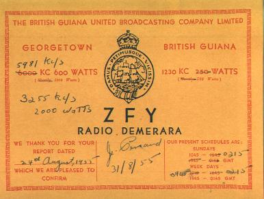 BRITISH GUIANA QSL card from ZFY, Radio Demarara, Georgetown, British Guiana, on 5.981 MHz for a report on 24 August 1955. Power was 600 watts ![]() British Guiana was a British crown colony until independence was granted on 26 May 1966. Interestingly enough, the station has recently returned to shortwave from Guyana. Back to Home Page |